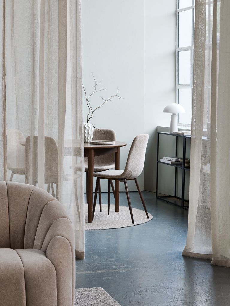 Polyester. With pole pocket and hidden loops. 1 x W140 x H300 cm
