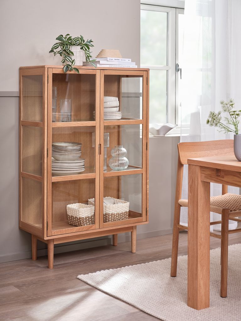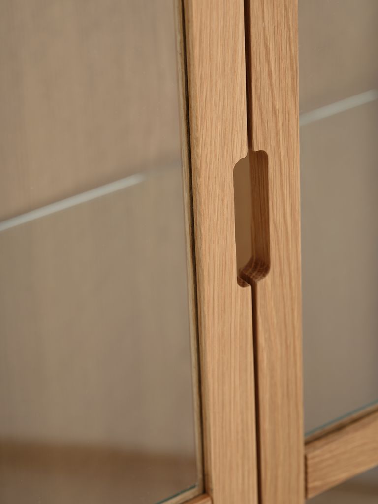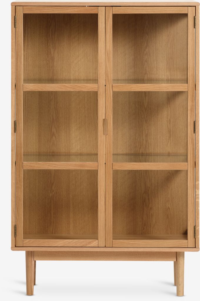 | Material | Front: Solid oak, Tempered glass, Top: Oak veneer, Particle board, Bottom: Oak veneer, Particle board, Solid oak, Side: Solid oak, Tempered glass, Legs: Solid oak, Back: MDF, Melamine, Shelf: Tempered glass |